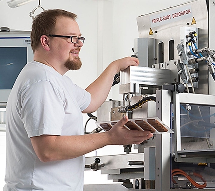 Con frullatori, rulli, padelle e macchine per il concaggio, Storck è dotata di cucine completamente attrezzate e di attrezzature complesse per la produzione dei campioni. Ingegneri alimentari, nutrizionisti e professionisti della tecnologia di produzione dolciaria lavorano in stretta collaborazione. Il personale del nostro reparto "ricette e farciture di cioccolato" sono veri e propri artisti cioccolatieri. Tutto ciò che garantisce l’alta qualità e l’unicità dei marchi Storck. Una volta che il prodotto entra in produzione, viene elaborato fino al minimo dettaglio e viene fatto a mano in piccole quantità.